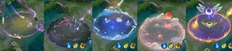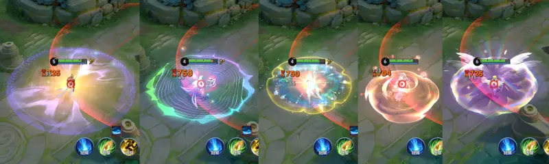 炸盾的特效都不一样,映山客做的最小,一朵花盛开的效果,乞巧织情做的最淡,但范围做的最大,长夜焕生的辨识度最高,细节做的也是最丰富的,但美少女的翅膀特效会有更精致的感觉。